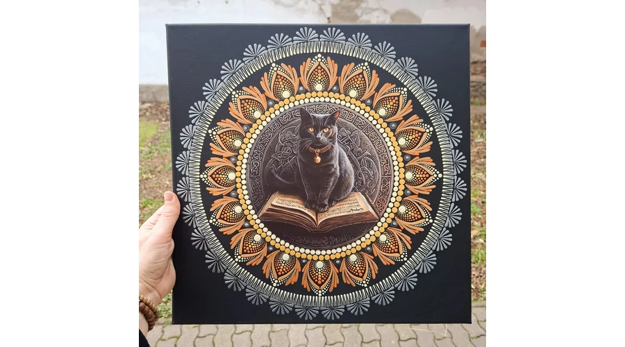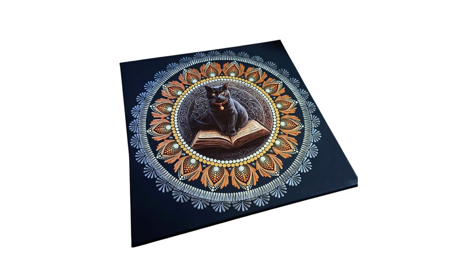 A Misztikus tudás őrzője mandala a belső erő, az intuíció és az ősi bölcsesség szimbóluma. A középpontban elhelyezett fém betétes fekete macska a spirituális védelem, a titkos tudás és a mágikus érzékenység megtestesítője. A macska előtt nyitott könyv a tanulás, az ébredés és a belső út jelképe.