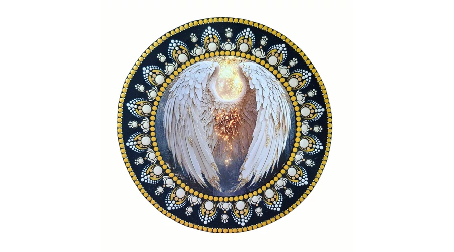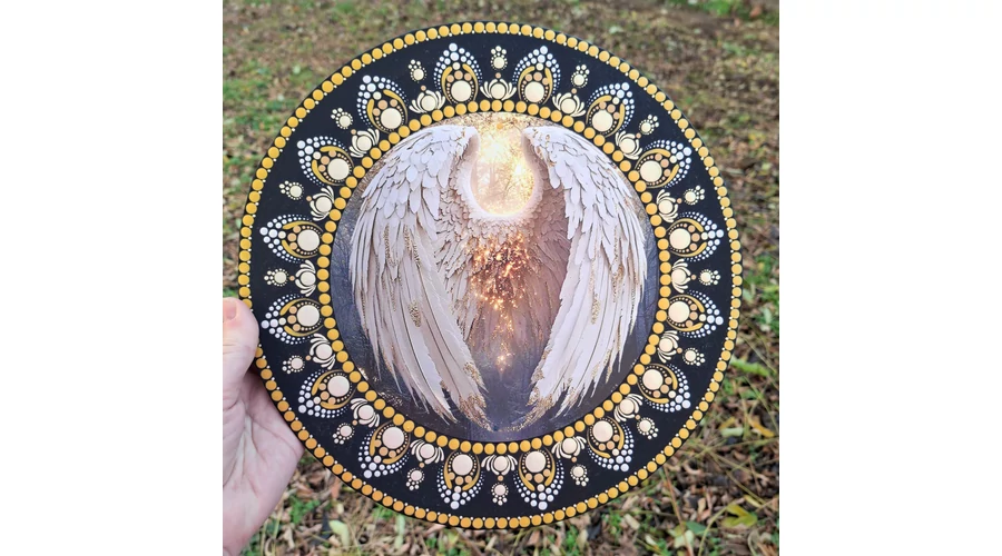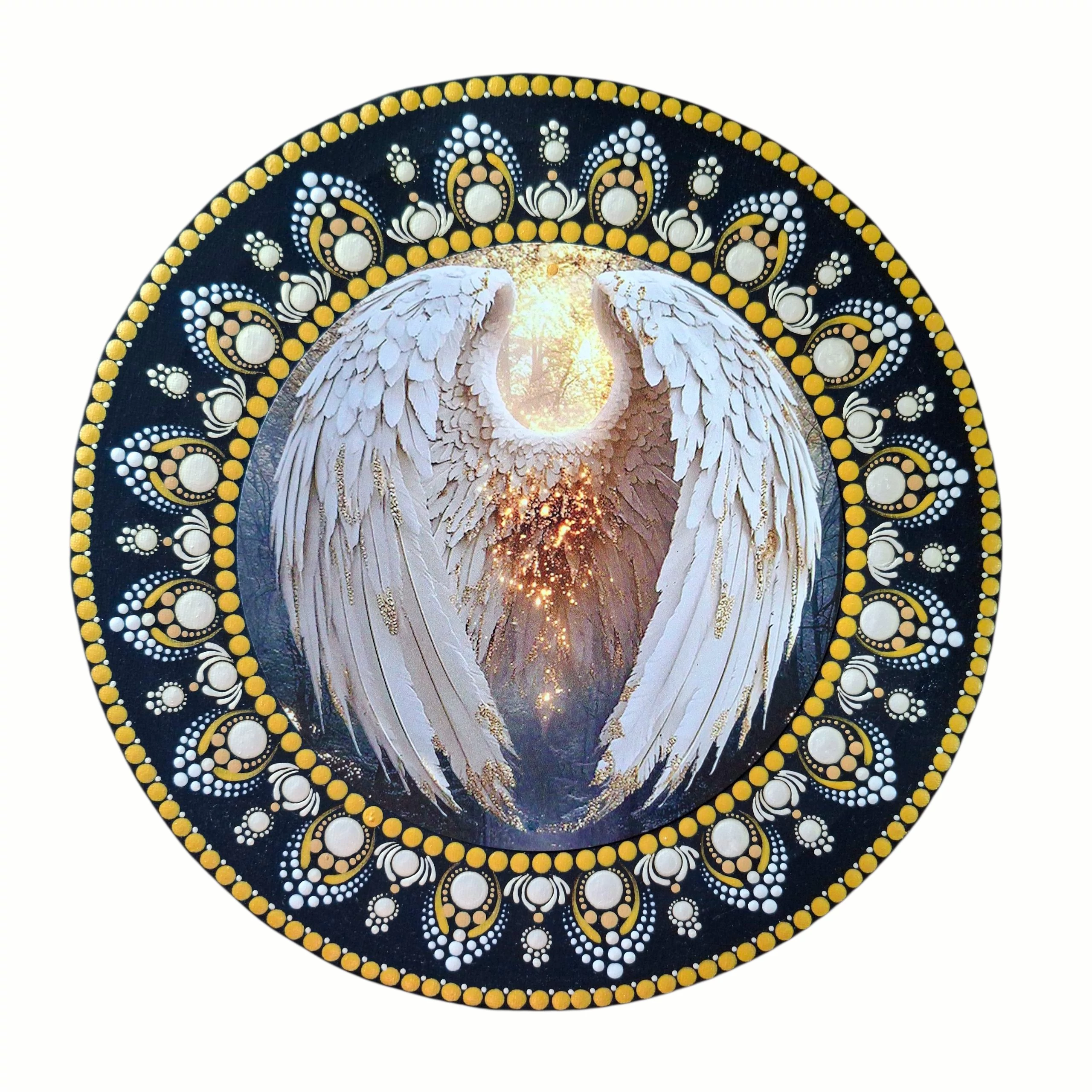 Ez az arany-fekete fémbetétes angyalszárny mandala a fény és az isteni védelem erőteljes szimbóluma.