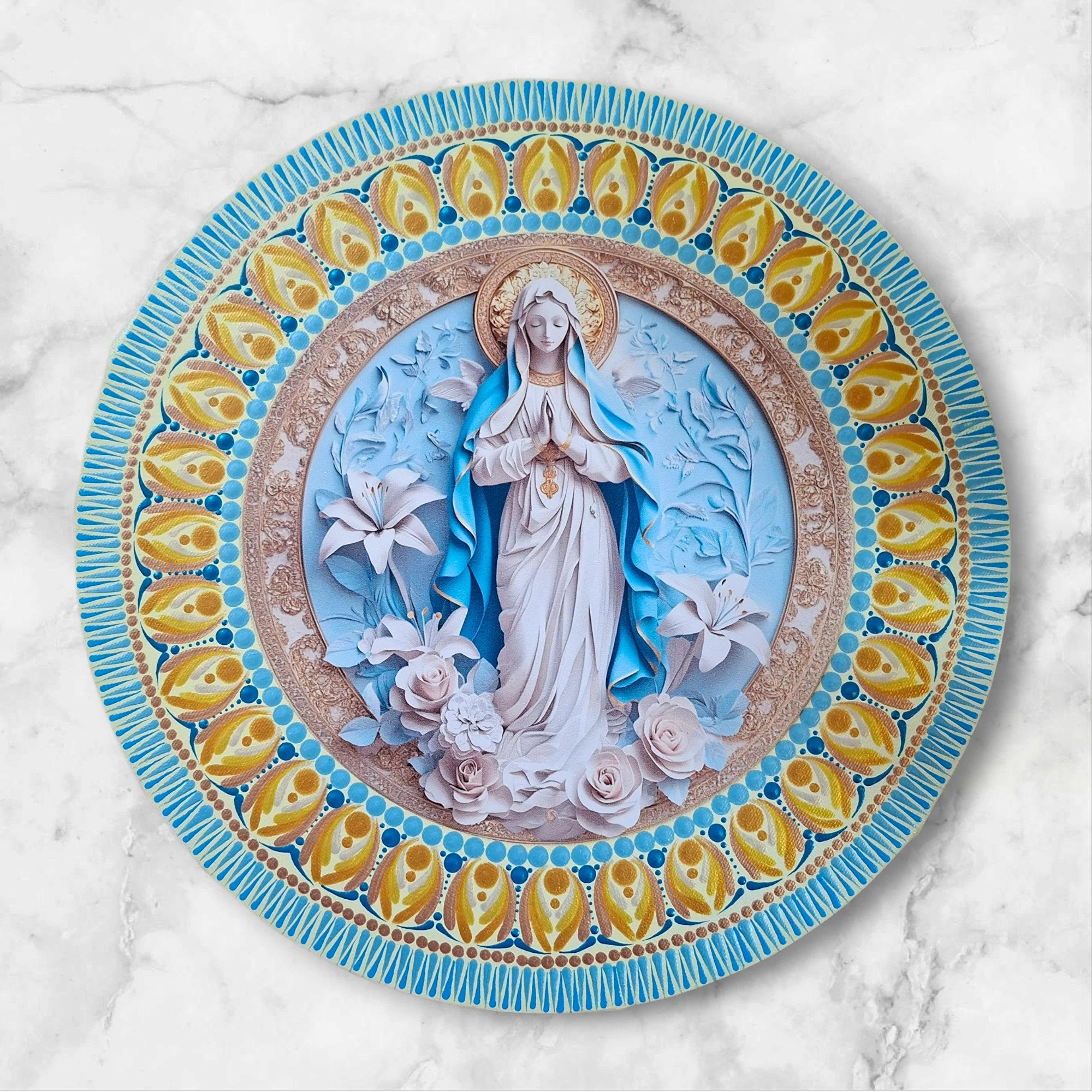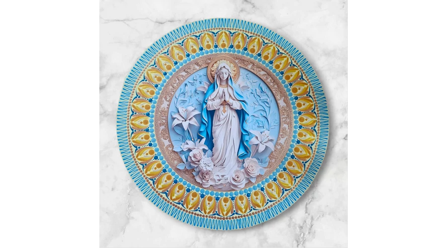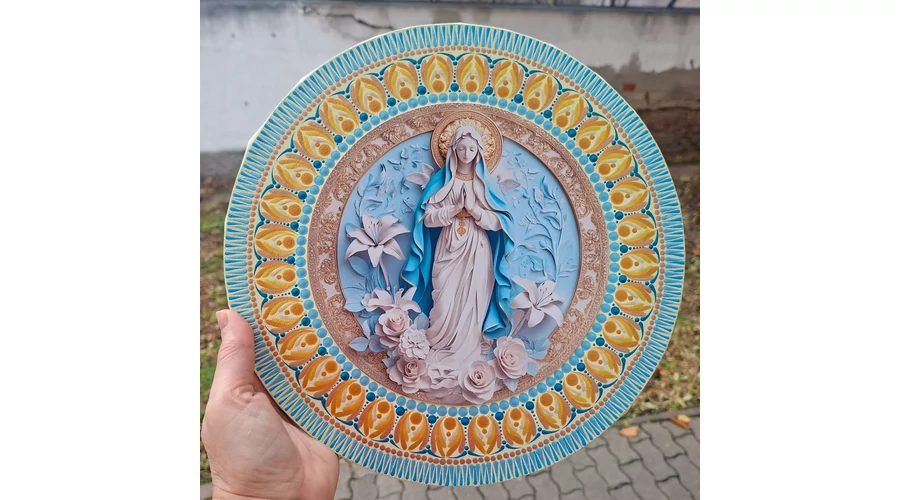 A középpontban egy finoman kidolgozott Mária-ábrázolás látható fém betéten: a béke és a gondoskodó jelenlét időtlen üzenetét hordozzák.