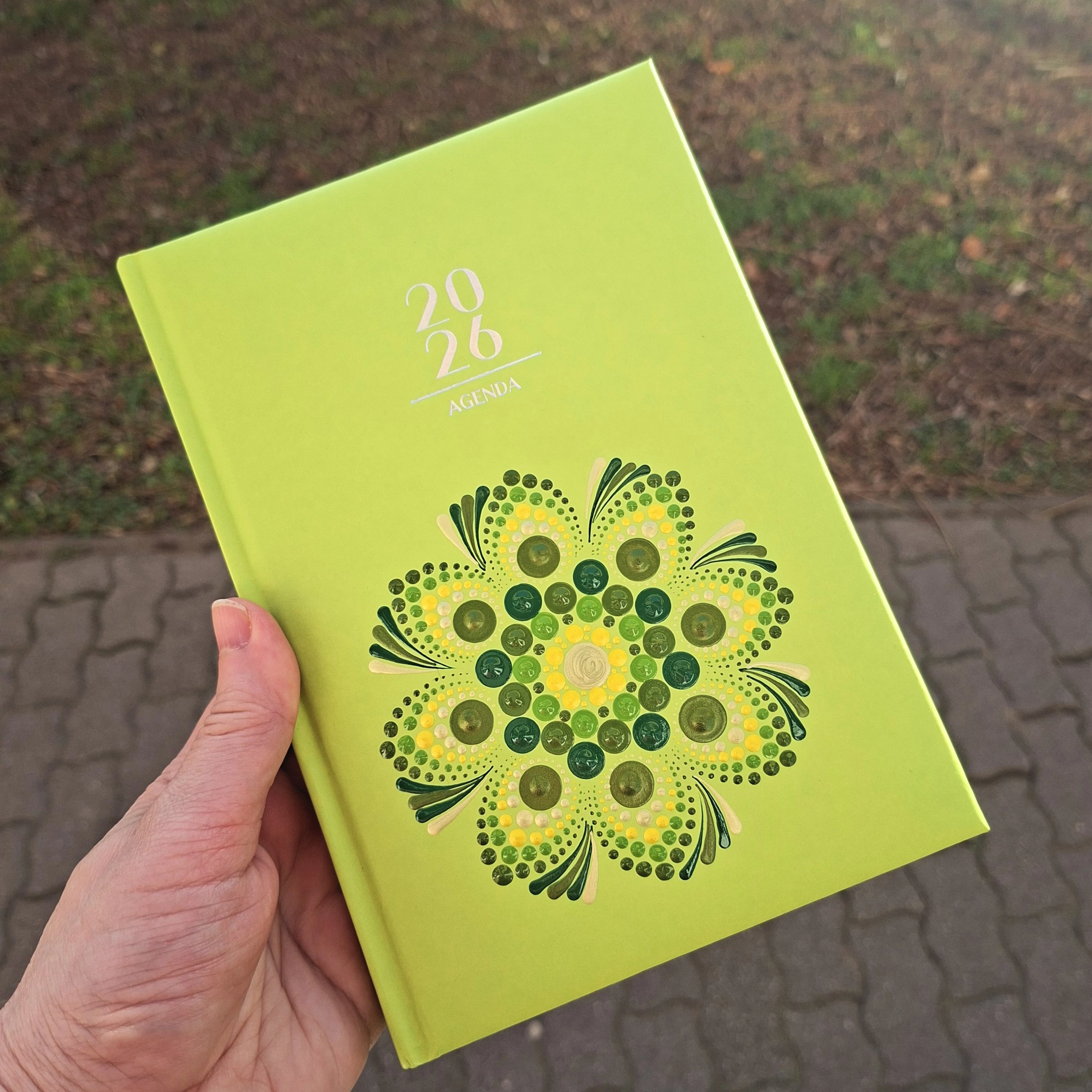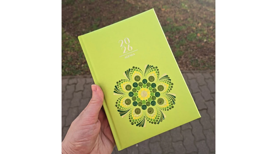Pontozott mandalás határidőnapló, 2026-os, zöld-sárga-arany mintával