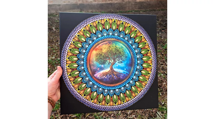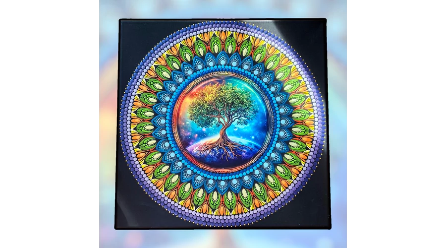 A központi Életfa a teremtés folytonosságát, a növekedést, a végtelen újulást és a fény felé vezető belső utat jelképezi. Gyökerei összekötnek a Föld stabil, tartó energiáival, koronája pedig az Univerzum végtelen tudására nyílik. A körülötte elhelyezkedő mandala – élénk kék, zöld, narancs és lila színek harmonikus rétegeivel – egy erőteret alkot, amely megtisztítja a teret, nyugtatja a lelket és támogatja a személyes fejlődést.