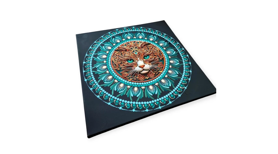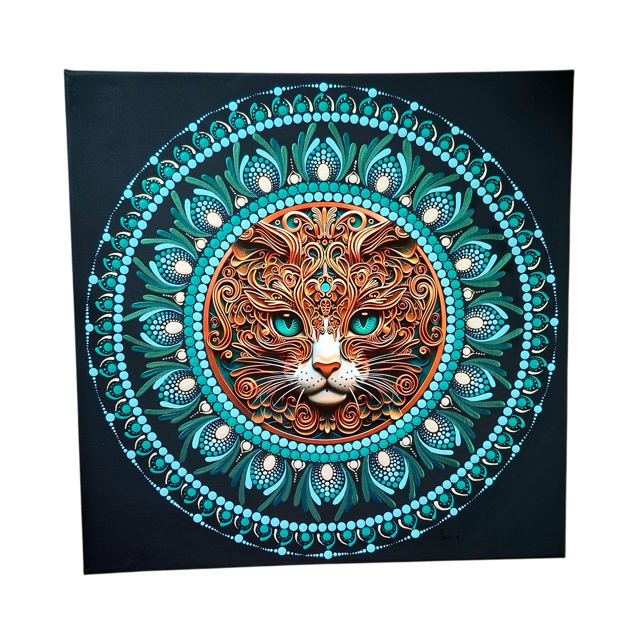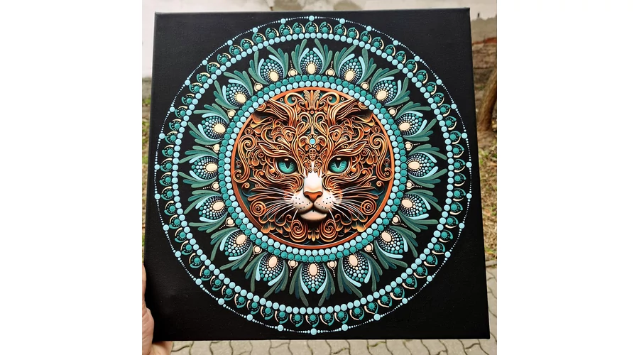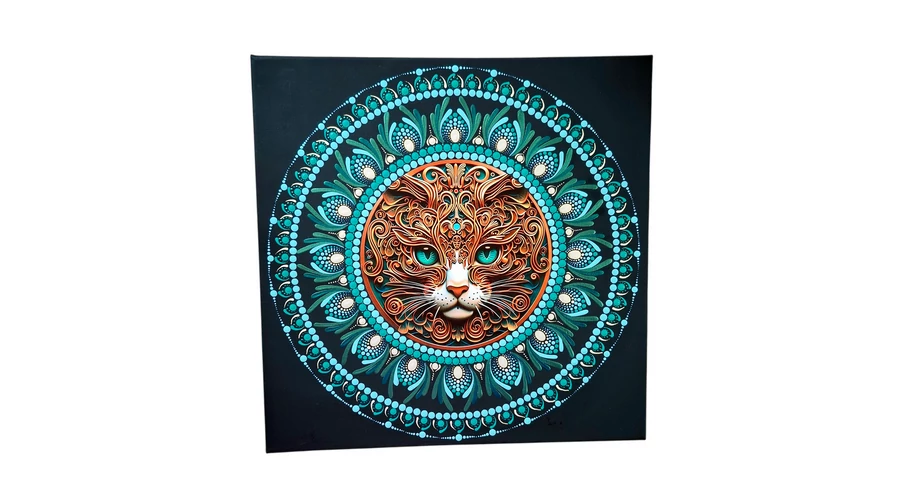 A Türkiz–arany lélekőrző cica mandala a macskák ősi, misztikus erejét és a mandalák harmonizáló rezgését egyesíti. A középpontban megjelenő cica aranyszínű, finoman kidolgozott mintázata a belső erőt, az önbizalmat és a tudatos jelenlétet szimbolizálja, míg a türkiz és kék árnyalatok a lelki tisztulást, kommunikációt és érzelmi egyensúlyt támogatják.